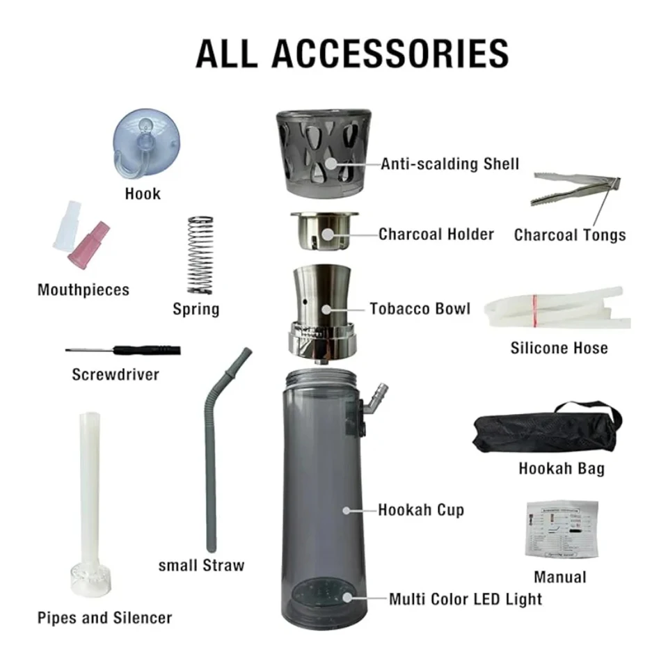 [EASY TO USE & CLEAN] The new modern design of this portable hookah is very easy to assemble and clean. All you need is a little water and your favorite bar to get the shisha ready. This hookah comes with reusable, eco-friendly accessories including a shareable silicone hookah hose and a single hookah tip.